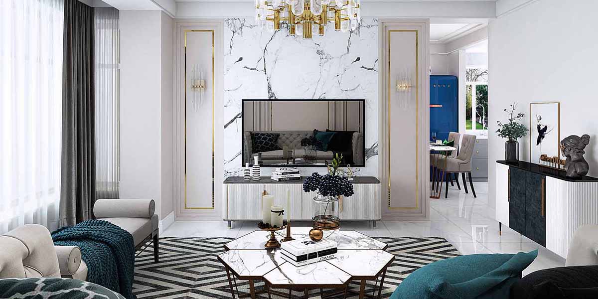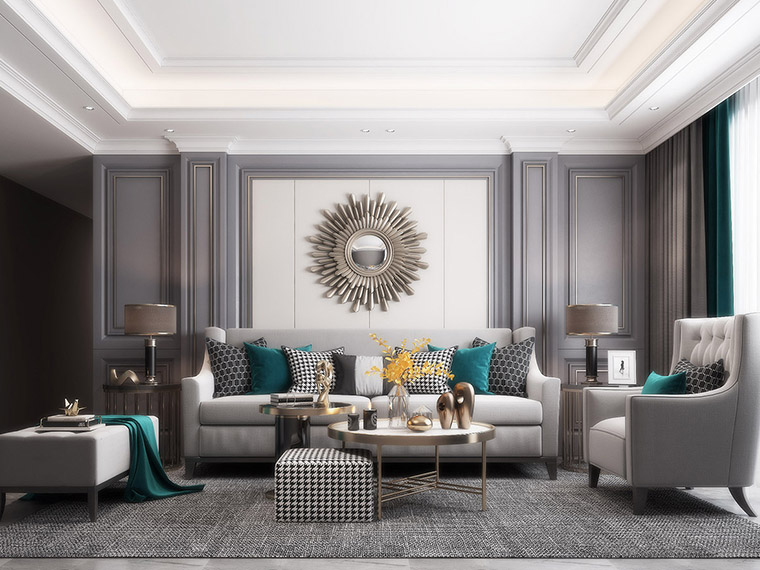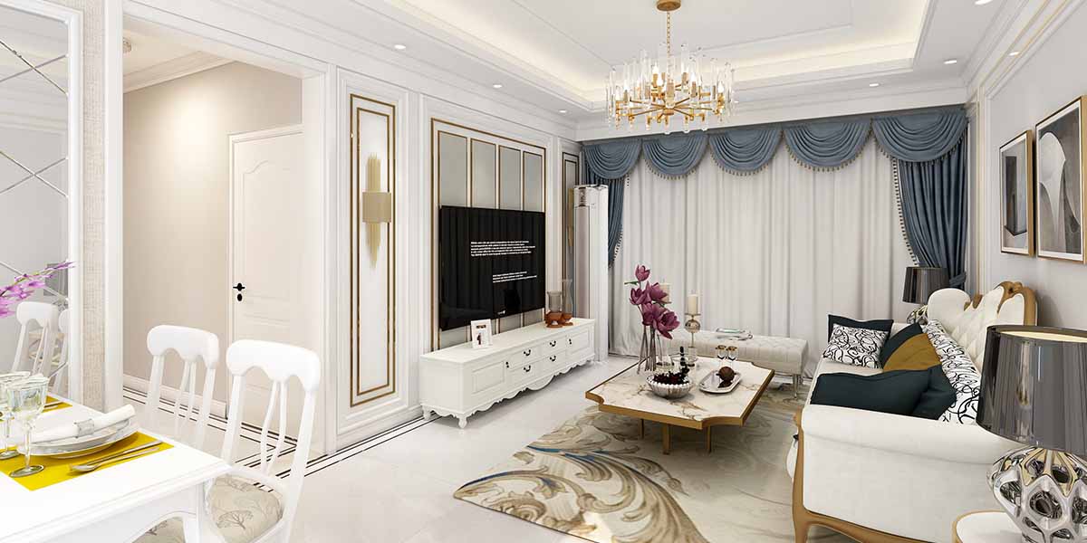 糅合了簡約主義的利落、爽潔和傳統(tǒng)歐陸風格的精致、華麗,淺淡的藍灰色加以玫瑰金裝飾線條,整體溫馨、時尚