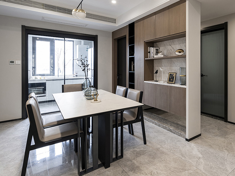 高檔暖灰色墻面,藍灰色墻柜既裝飾了電視背景墻,更是增加了儲物功能,小餐廳用上精美的凌鏡裝飾墻面,延伸餐廳的整個空間。